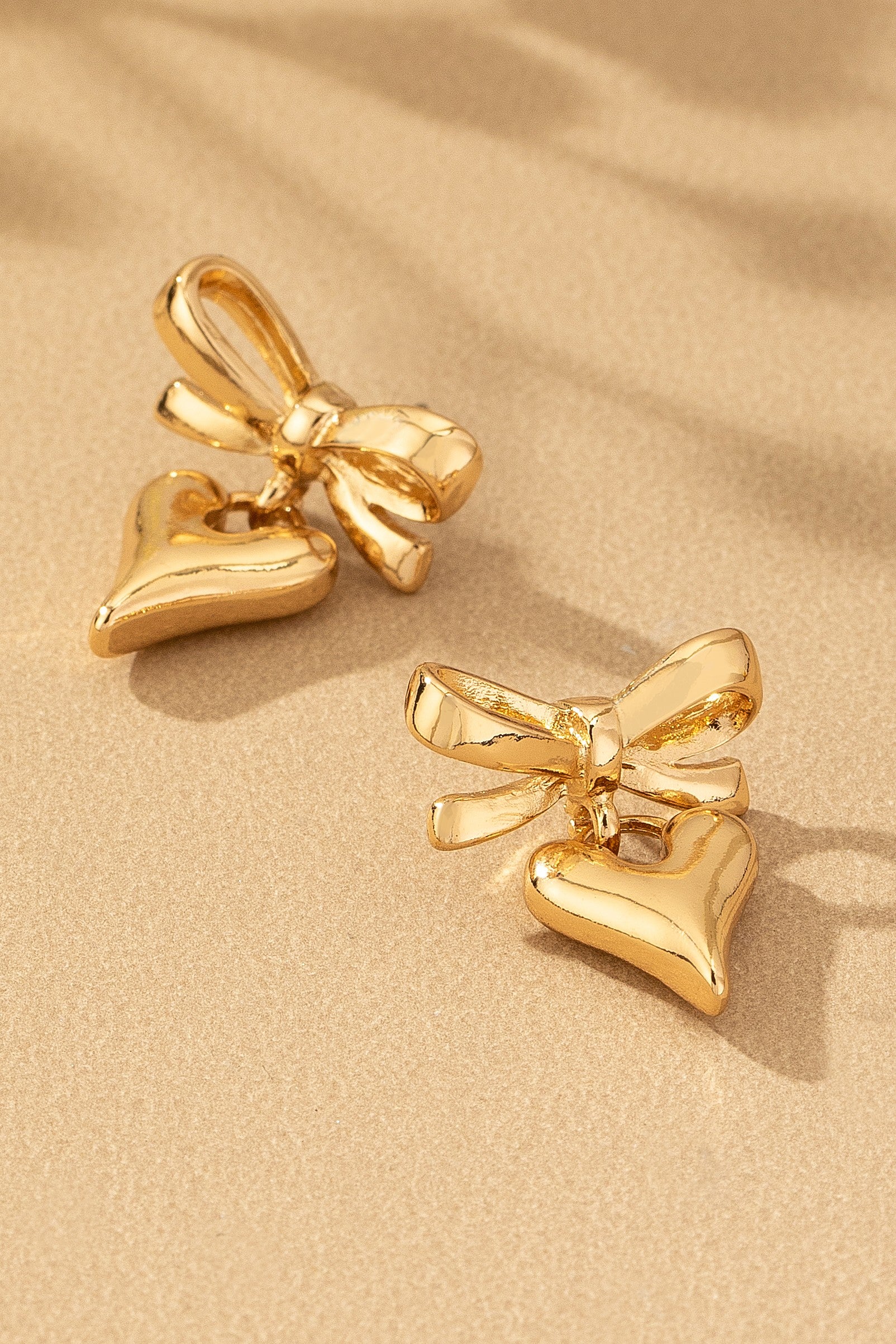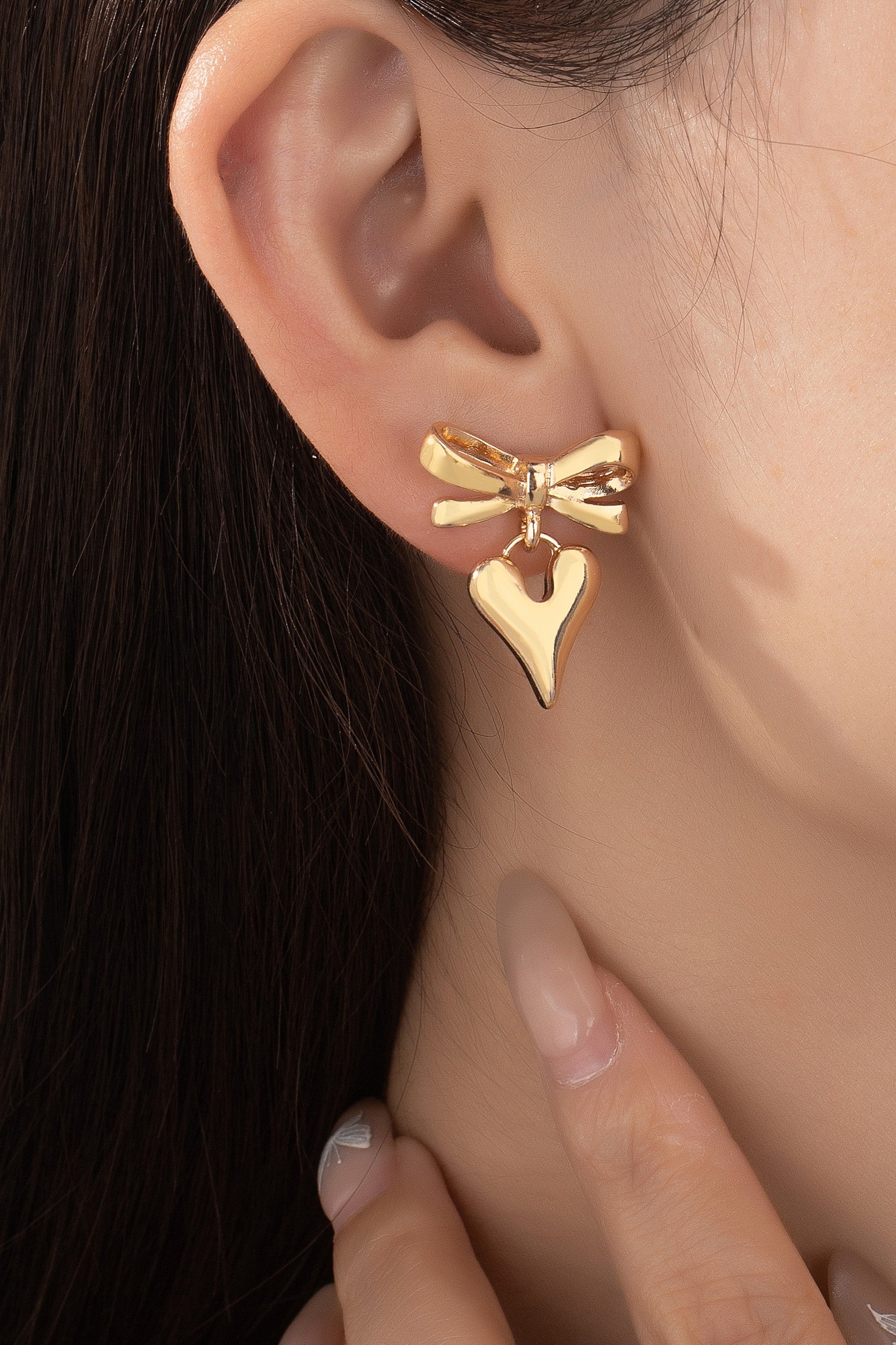 Looking for a charming and elegant accessory to complete your look? Look no further. These gold bow and heart drop earrings add the perfect touch of romance to any outfit. Made with high-quality gold-plated brass, they are lightweight and versatile for any occasion.