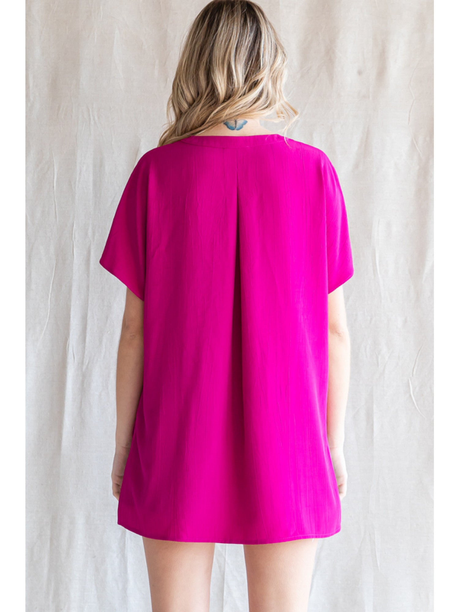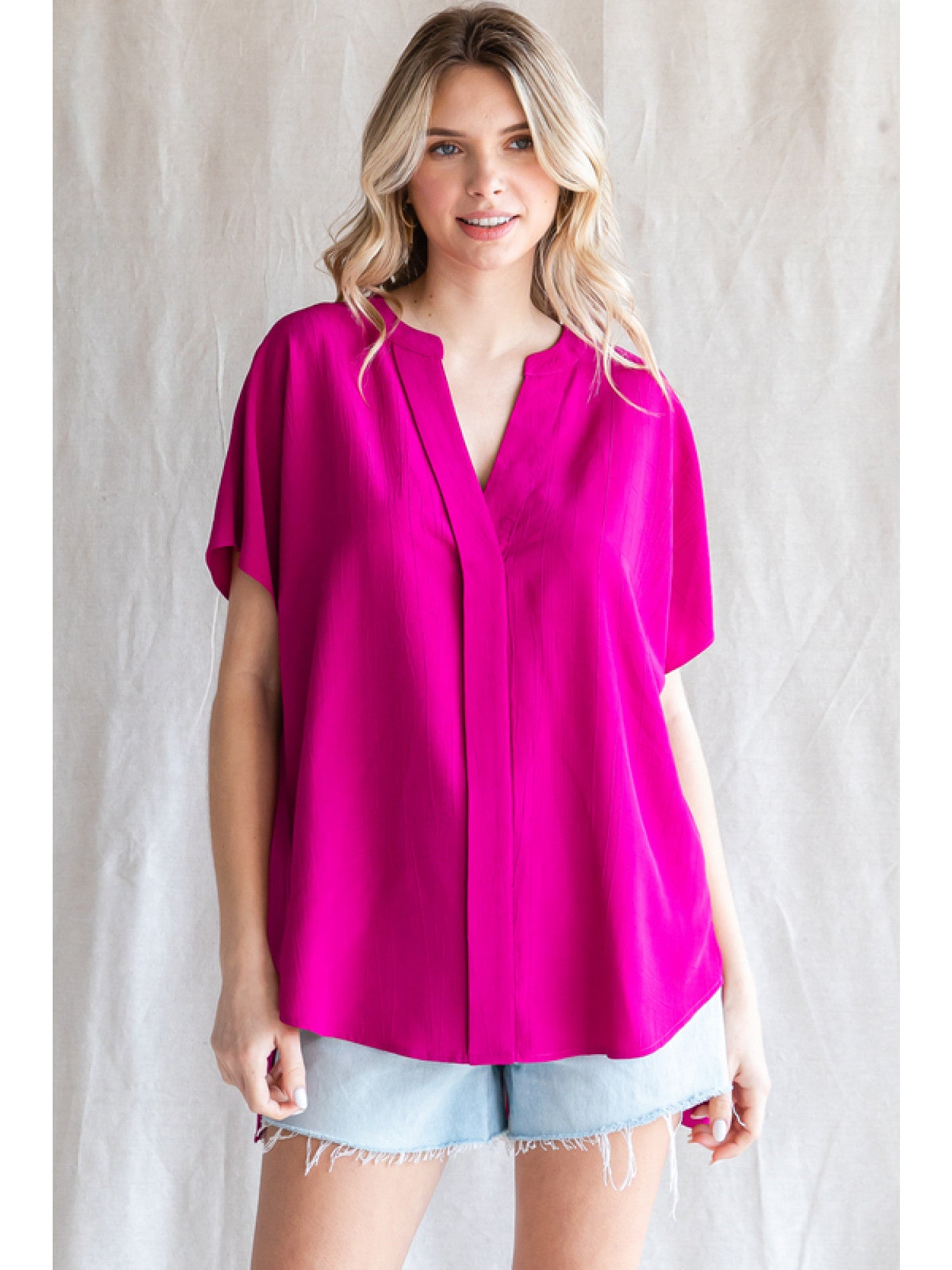 This Fuschia and Fabulous top is perfect for the fashion-forward woman. With a slit collarless neck and back pleating, it offers a chic and stylish look. The short kimono sleeves and vented hemline add a touch of flair, while the lightweight and non-sheer fabric ensure maximum comfort and wearability. Made from 100% polyester for durability.
