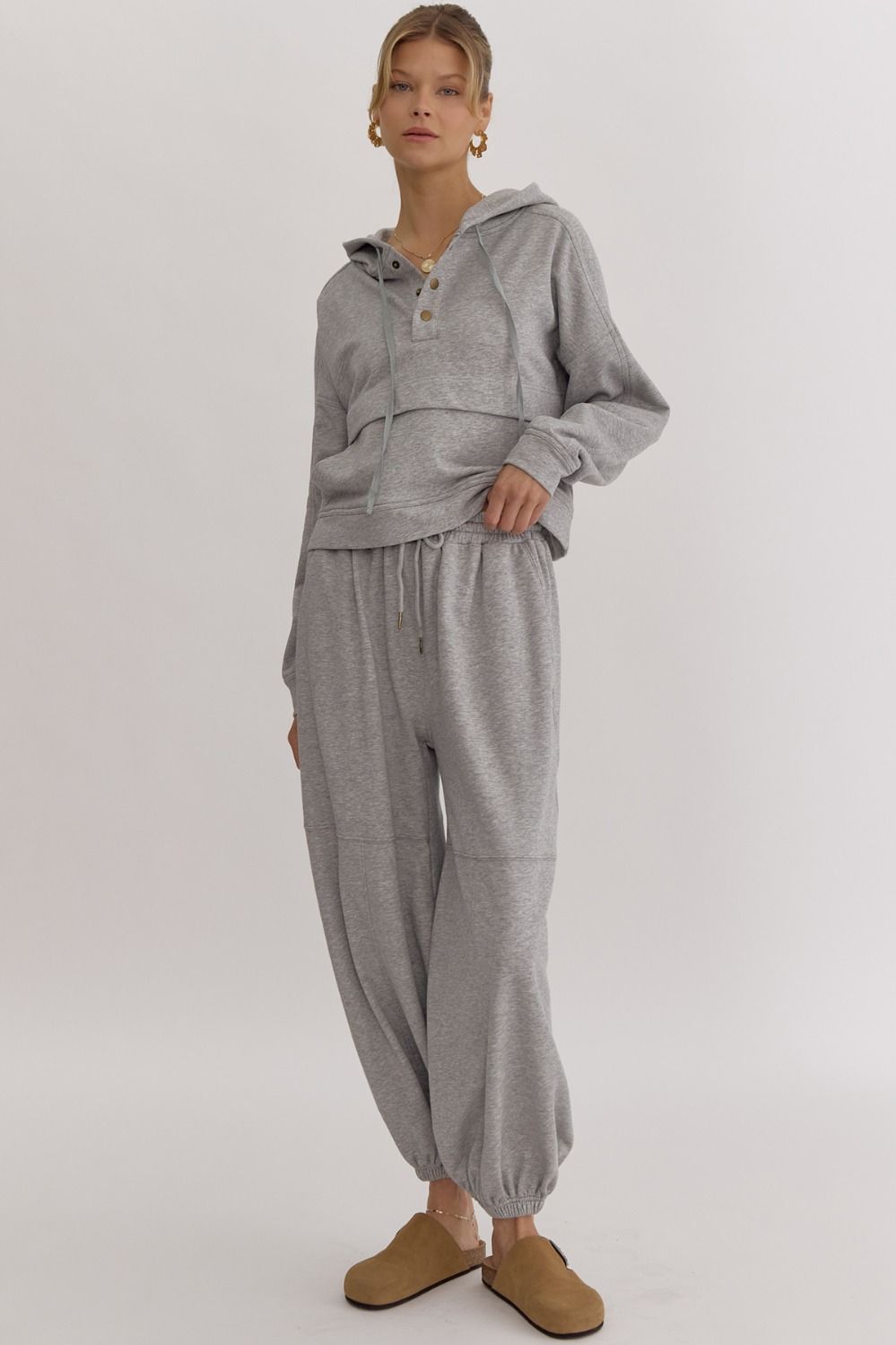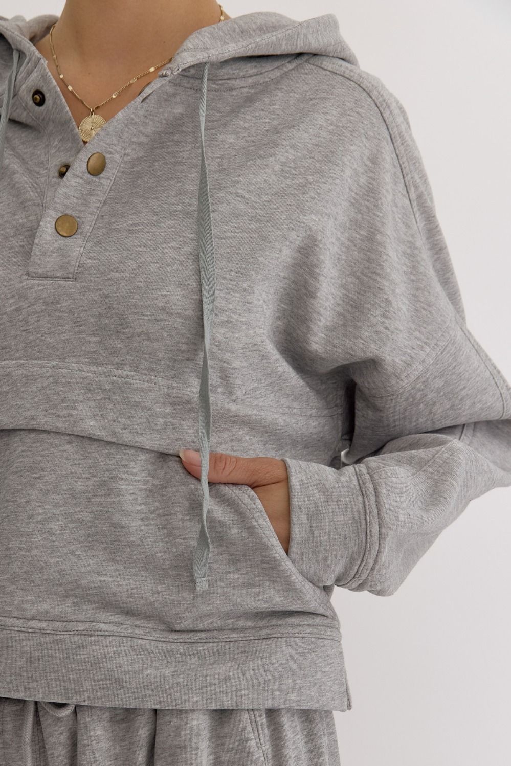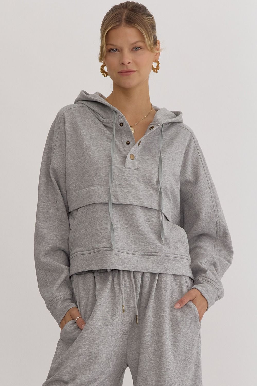 Solid long sleeve sweater featuring hood. Self tie and button closure at front. Front pocket. Unlined. Knit. Non-sheer. Mediumweight.Bottoms - 100% cotton