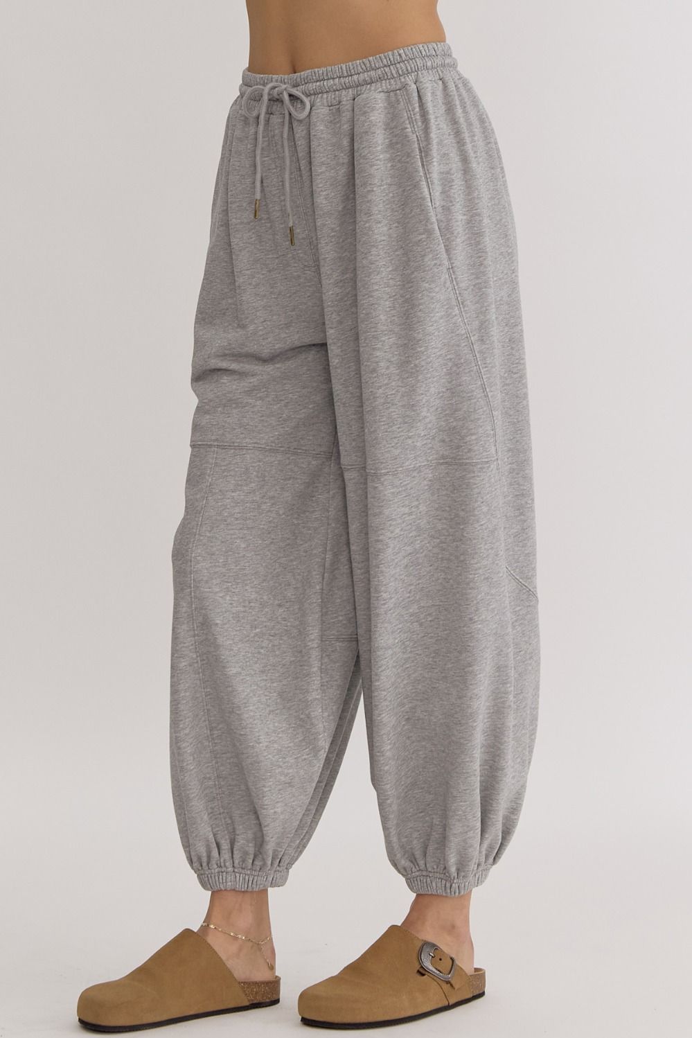 Solid high waisted sweatpants featuring self tie at waist. Elastic waistband. Pocket at sides. Unlined. Knit. Non-sheer. Mediumweight.